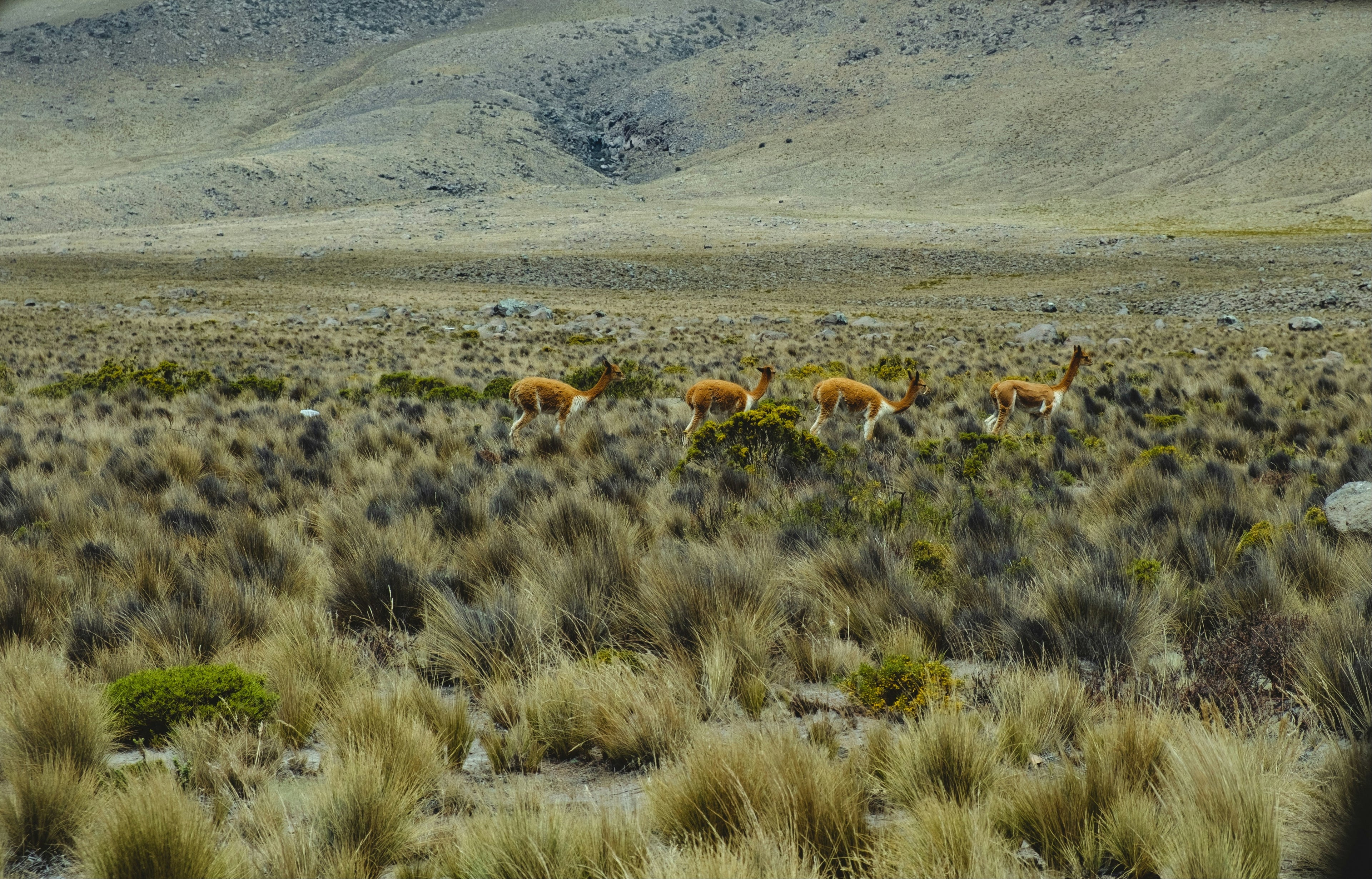 The rarest and most precious of all Andean fibers, vicuña wool has been revered since the time of the Inca, when it was reserved exclusively for royalty. With an astonishing fineness of just 12 microns, it is the softest and most delicate natural fiber in the world. Vicuñas roam wild in the Andean highlands and are carefully sheared through sustainable conservation efforts that protect both the species and the communities that depend on them. As the national animal of Peru, the vicuña embodies the deep cultural and ecological significance of Andean textile traditions.